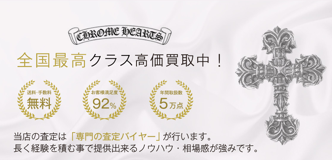 クロムハーツ ネックレスの買取査定はブランドバイヤーへ!宅配買取ブランドバイヤーではクロムハーツネックレスの全モデル高価買取中です!各アイテムの定番商品(クロス・オーバル等のモチーフ)等は常に人気があり高額査定対象商品となります。シルバーアイテムは多少の傷スレではさほど減額対象になりにくくお見積りだけでもまずは査定をご依頼ください。全国どこでも無料にて宅配キットをお送りいたしておりますのでお気軽にお申し付けください!
