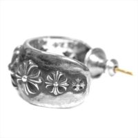 こちらは「クロムハーツ ワイドフープ CHプラス ピアス シルバー」になります。ワイドフープ型にクロムハーツの人気モチーフ、「CHプラス」がデザインされたピアスです。端から中央に向かったて徐々にクロスが大きくなる、細かい拘りが見えます。同ピアスのスモールタイプになりますが、インパクト十分のアイテムです。