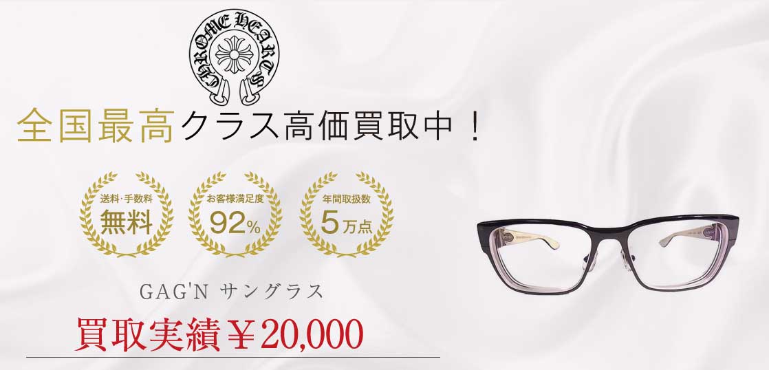 こちらの商品はクロムハーツの眼鏡「 GAG'N 」です。中古品ではありますが、弊社基準より使用感が見られず、傷の少ない商品です。探しの方も多く見られるためこちらの買取価格で買取させていただきました。またクロムハーツの眼鏡は保証書の付属の有無で金額が変動いたしますのでご依頼の際は必ず一緒にご依頼いただくのが高価買取のポイントです。買取金額に関しましてはお気軽にお問合せ下さい。