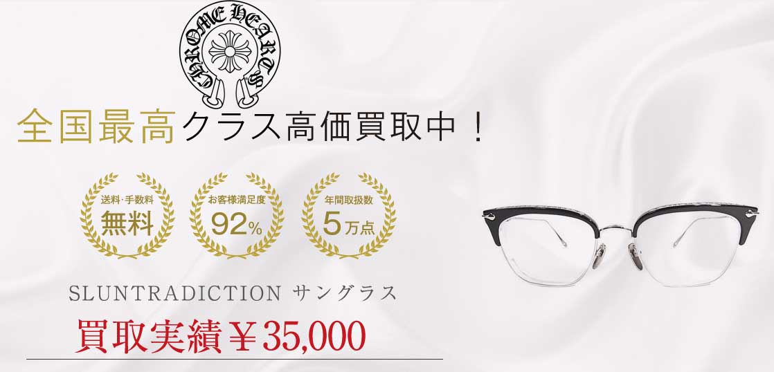 こちらの商品はクロムハーツの眼鏡の中でも人気の高いハームリム仕様の「SLUNTRADICTION」です。インボイスなどの保証書は付属していませんでしたので多少の減額となりましたが中古市場でも流通数が少なく、状態もほとんど傷が見られない状態の良いお品でしたのでこちらの買取価格で買取させていただきました。クロムハーツの眼鏡は保存箱等、付属品の有無と、状態によりさらに金額が変動いたします。買取金額に関しましてはお気軽にお問合せ下さい。