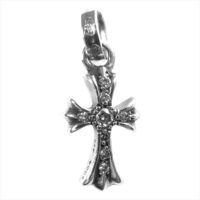 こちらは「クロムハーツ ベイビーファット パヴェ ダイヤ チャーム ペンダントトップ シルバー」です。ベイビーファットシリーズのクロスのフロントに大きめのダイアモンドを採用し、さらにその周辺を小ぶりのダイアであしらったラグジュアリーなアイテムです。クロムハーツのクロスはジュエリーとの相性が良く、ダイアモンドやサファイヤなどのモデルも人気です。