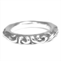 こちらは「クロムハーツ スクロールバンド リング シルバー」です。「スクロールバンドリング」は、ロサンゼルスの西海岸イメージしてデザインされた細身のリングです。リング全体に波模様の造形が施されており、繊細で美しい指輪です。クロムハーツシリーズの指輪の中では細身なモデルですので、気軽に普段使いできます。こちらのリングは、男性のみならず女性人気も高いです。